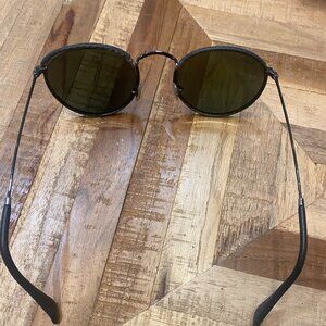 Custom-made all black Ray-Ban Rounds featuring leather trim around the lenses. Leather shows wear and tear, slight scuff on nose bridge: price reflects as such.