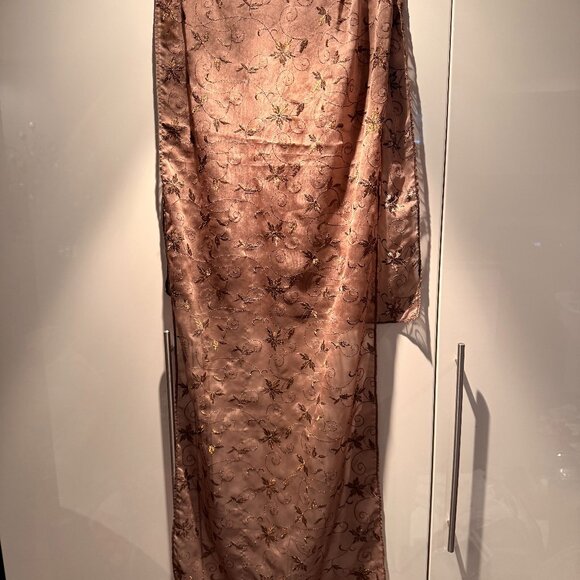Soft taupe/light brown-toned scarf featuring all-over embroidered floral and scroll detailing with subtle gold metallic thread accents. The lightweight fabric has a gentle sheen and drapes beautifully, making it easy to style in multiple ways.