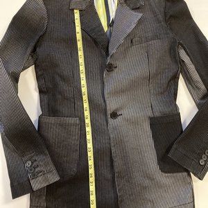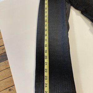 Approximately a medium (see measurements below). Fabric is a narrow cord-type that gives the jacket a black / silverish two-tone look with texture. Good for evening activities where you want to dress up a bit but not wear a more formal suit (good for dinners out, networking events, lounges and some dressier clubs). Pairs well with jeans, black denim, wool pants, etc.). Selling because it no longer fits me. Excellent, lightly used condition (no rips, stains, holes, smells, etc.).