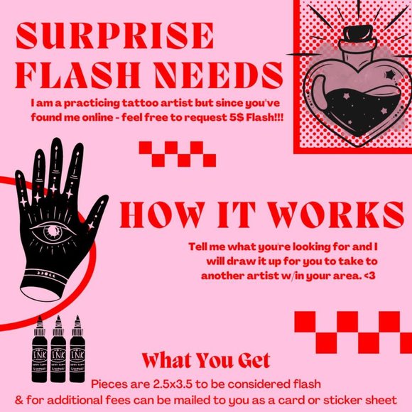 I'm a jack of trades, so amongst my history with art I got into tattooing and since I am your internet goblin friend - feel free to commission five dollar flash from me! Pieces are 2.5x3.5" at most, but can be smaller (and will do a series of lil cuties if you go smaller). Each piece will be mailed to you and for an additional fee can be made into sticker sheets!