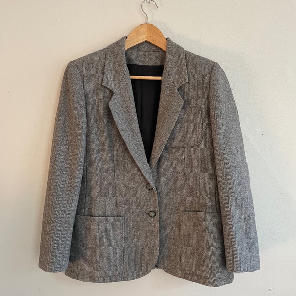 Beautiful subtle tweed wool blazer. Single breasted, subtle shoulder pads. Unbranded and no size tags but fits like size 10-12