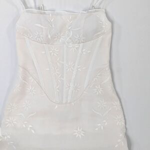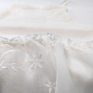 Vintage floral embroidered Organdy in a clean crisp white. In hand, a rare high quality textile that is unmistakably unique, presenting similar to a silk organza. The dress is made from three vintage table cloths that I found years ago & have been carefully storing ever since.
