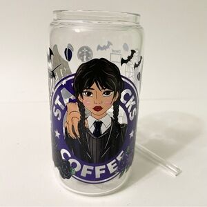 Custom Wednesday Addams Clear Glass Tumbler with Lid and Straw