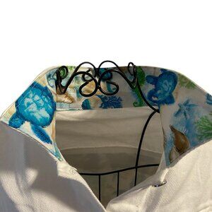 This jacket is beautifully adorned with ocean-themed fabric featuring intricate designs of sea turtles, shells, seahorses, and starfish, creating a fresh and coastal-inspired look. Perfect for adding a unique, artistic touch to any outfit!