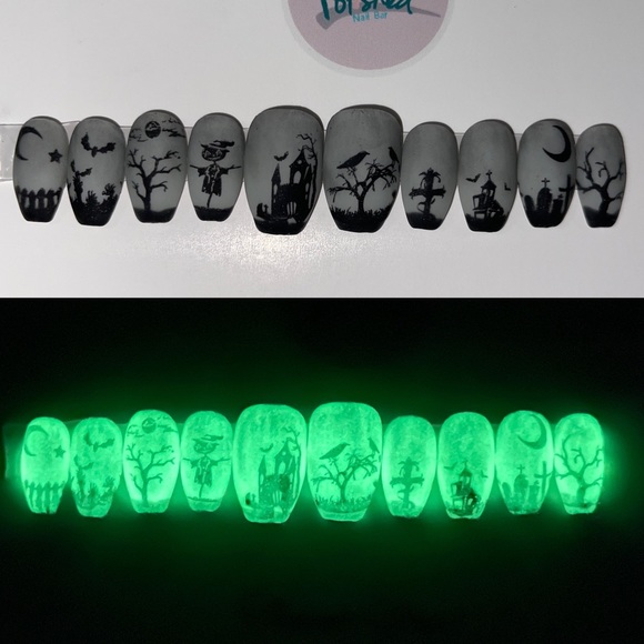 Custom made press ons done with gels so they are very strong and reusable. Comes with everything you need for application glow n the dark!