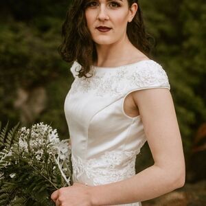 Capped shoulder moving into plunging V back to natural waist. Hand stitched beaded french Chantilly floral through neckline, waist and high hip. Real button & loop center back closure. Train is about 24".