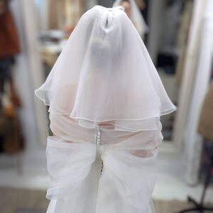 Strapless, steel boned bodice. Full circle floor length skirt with pockets. Custom crinoline, that will be removed after the wedding for future use. Center back button & loop closure, the real kind. Silk organza bateau, silk organza bow/train/ removable + 50's inspired silk organza veil.