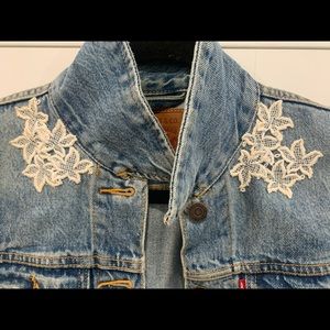 Customized Levi’s jacket. Lace around collar is genuine 1950’s lace recycled from a wedding dress of that era. Only worn 3 or 4 times, was bought with the distressed hems. Fitted look