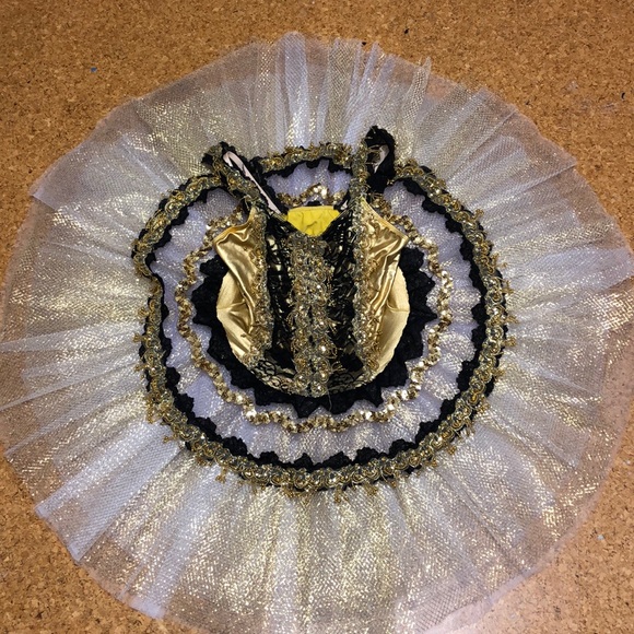 Beautiful gold tutu, perfect for a solo. Their is some small gold patches missing from the back of the bodysuit. If you are interested please leave a comment and I will post more pictures.