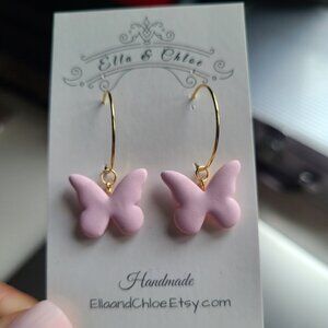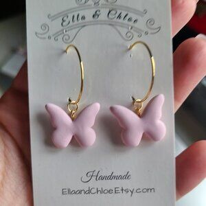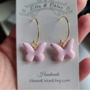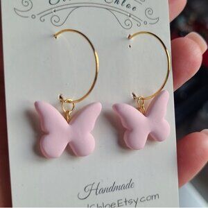 Super Cute 18K Gold Plated Matte Pink Clay Butterfly 20mm Dangle Drop Hoop Earrings