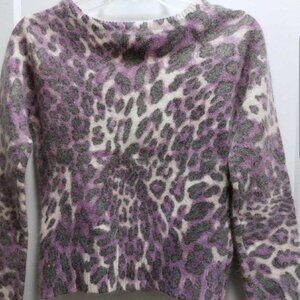 Stay stylish with this cute purple and gray animal print cardigan. This eye-catching piece features a bold purple leopard pattern, perfect for adding a pop of color to your wardrobe. The fabric a cosy soft angora blend.