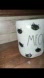 Charming Rae Dunn mug with black cat faces. Cream background. Perfect for cat enthusiasts.