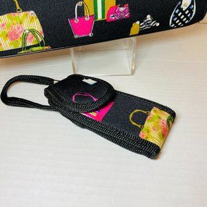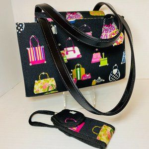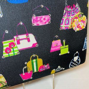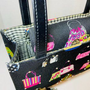 Cute Black Purse Bag with printed images of purses with bright colours all over.