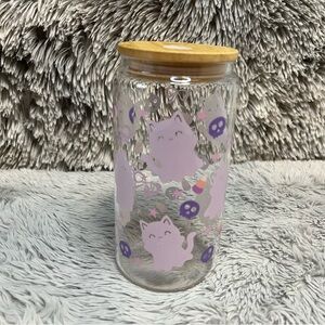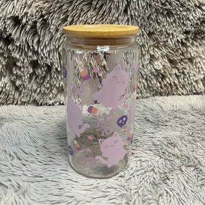 Adorable glass jar featuring cute cat designs. Comes with a wooden lid