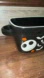Black ceramic dish with Halloween-themed designs. Features white skulls and orange pumpkins.