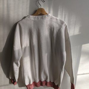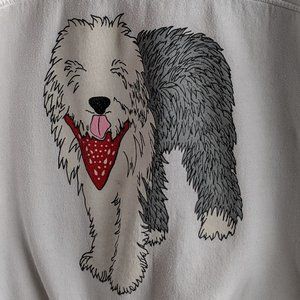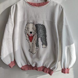 White pullover sweatshirt with red striped trim and sheepdog on the front