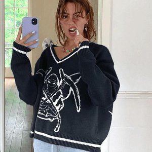 Cute Grim Reaper Knit Sweater Oversized Fit Y2K Aesthetic