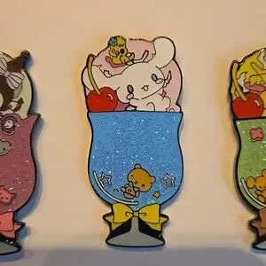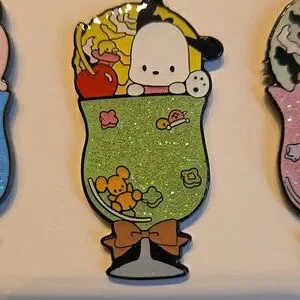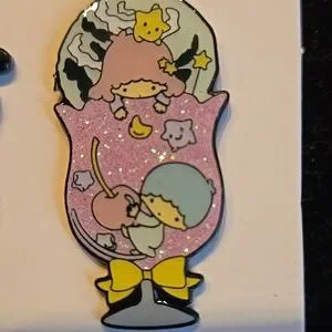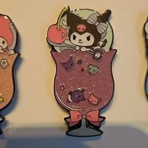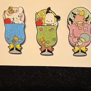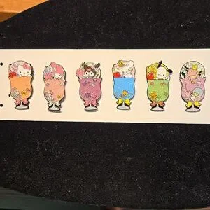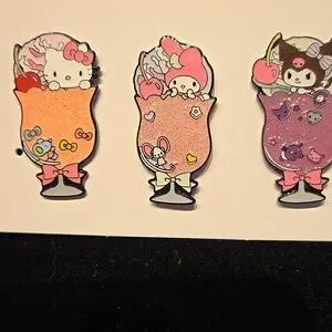 Set of six adorable character enamel pins. Features vibrant colors and glitter accents. Perfect for collectors and fans of everything Hello Kitty!