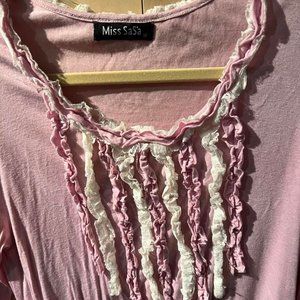 This cute long-sleeved light purple top features vertical "ruffles" in purple and white along the front. By Miss Sasa, this top features an elastic waist band and continues downwards below the waist band. Size Medium, in like new condition!