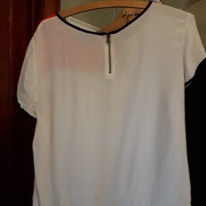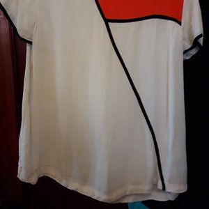 100% viscose. I love this top but cant wear white because I have little kids! Great with jeans ot tucked into a black pencil skirt.