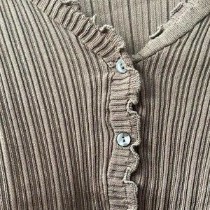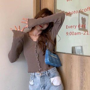 Cute Ribbed Cardigan Slim Fit Lettuce Trim Brown Color Indie Aesthetic
