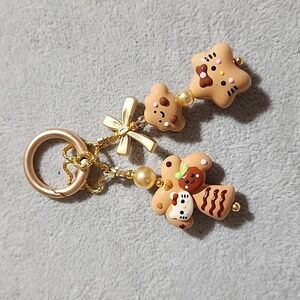 Adorable tan keychain accessory featuring charming Hello Kitty designs. Perfect for adding a playful touch to bags or keys.