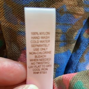 Cute Top with Ruching and Drape Neckline. Has ruching through the front. Is nylon fabric with double layer through bodice so not sheer. But sleeves are single layer so semi-sheer. Size small. Neckline has a very soft, pretty drape. Colours are salmon, emerald green, blue and brown. Nice neutrals.