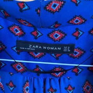 Cute, blue and red patterned sleevless Zara top, size small with a crossover front and an asymmetric hem. It's a very light synthetic. It has been worn but is in great shape.