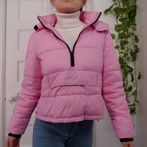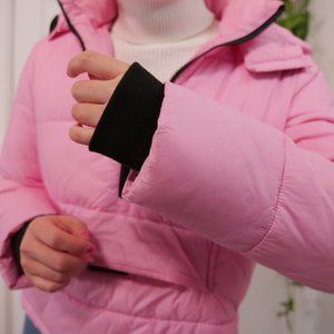 this bright pink puffer is super cute and warm, there are side zippers make it much easier to wear and take off, just like a hoodie but much warmer!