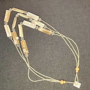 Not sure what the necklace is made out of but it looks like beads and shells- it’s very pretty on!!