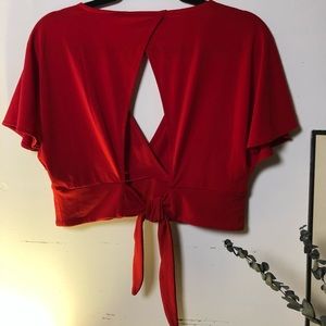 The wrap style in the front and the open back will make this crop top a statement piece in your wardrobe! The brilliant cherry red is just perfect!