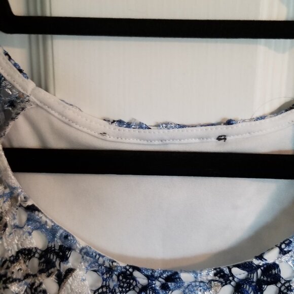 Blue and grey pattern on lace overlay, white lining