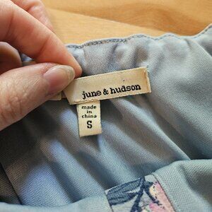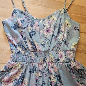 Really cute jumpsuit with light colours. Jumpsuit is light blue, flowers are light pink and yellow.