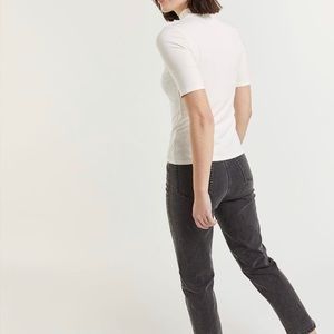 Chic day or night. An alluring, slim cutout above the chest shows a little skin to keep things interesting. This figure-hugging mock neck top is accented with a subtle rib texture woven from supersoft sustainable fibres with a touch of comfortable stretch. - Elbow length, set-in sleeves. - Eco-conscious fabric. - Straight hemline. EcoCosy (R) fibres are made from certified sustainable wood pulp from sustainably-managed and renewable plantations. Its natural raw materials also means that these fibres are biodegradable.