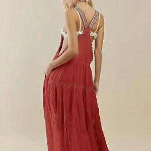 Adjustable brace straps, bib style overall dress. Tiered maxi length skirt and cutout waist. Note that the photos show two slightly different pieces (strap color is different). This dress is the one with the patterned straps. This is NOT a jumpsuit.