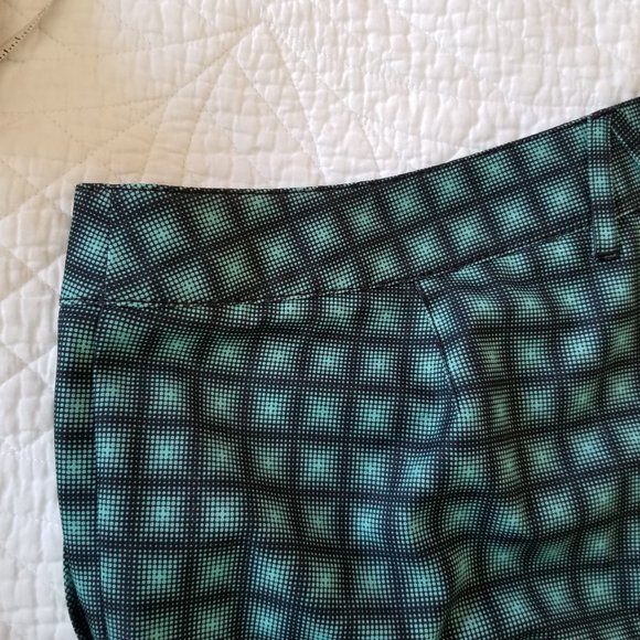 Teal and black pattern, super lightweight. 10" inseam. Note 3 belt loops, 2 in front, 1 rear middle.