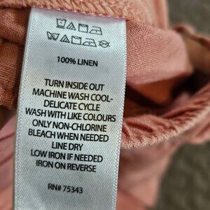 Elasticated waist, front pleats, front and back flap pockets, tie at waist.