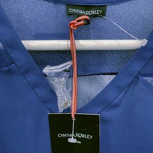 This blouse is new with tags and includes a spare butto, as well. 100% polyester lightweight sheer material, very elegant and classic styling. Long sleeve, vee neck, slight drop hem in back. The colour is a royal blue, almost purple. Features very small metallic buttons at the sleeves. Shirt is a pullover style.