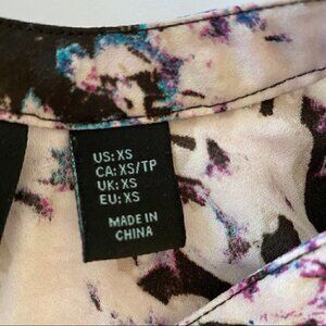 Cynthia Rowley print top with short sleeves. Crew neck with zipper back opening. Straight cut for a loose flowy fit.