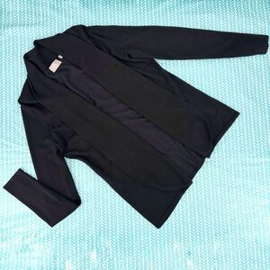 Elegant black cardigan. Open front design. Long sleeves. Two front pockets.
