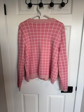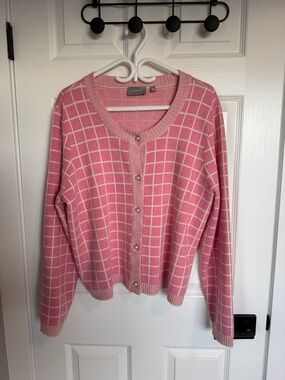 Cyrus women's cardigan in a pink grid-check pattern. Soft knit with pearl-style buttons. Crew neckline and long sleeves. Lightweight layer for everyday wear.