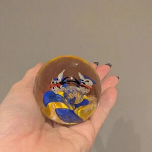 Enhance your home decor with this exquisite handcrafted glass paperweight. Featuring a stunning blue and yellow design, it adds a touch of elegance to any space. Perfect for art lovers and collectors.