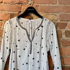 *White & black heart patterned top with 3/4 sleeve, v-neck and lace detailing. *Materials: Rayon
