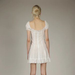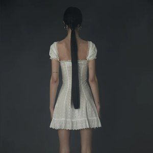 Authentic Daisy Limited (Australian clothing brand, previously Daisy Daisy TV) Terrestrial Paradise Dress / Broderie Day Dress in white embroidered eyelet cotton. This light cotton sundress has short puff sleeves, ruffle trim, lace-up waist, and hidden zipper at the back. Bought direct from the DAISY website in Australia (shipping + currency conversion fees, duties/import fees, were extra).