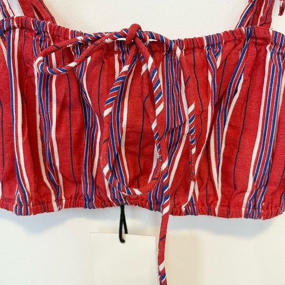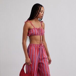 The Karmen top is our red and blue tie front cami bralette top with an all over stripe design featuring tie up straps with a bow front detail.