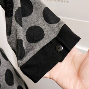Corporate goth polka dot dress with a sweetheart neckline and waist tie at the back. Light sweater level thickness, perfect for fall. No fabric tags.