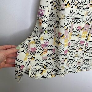 In great condition. 100% polyester. Abstract colorful print. Cap sleeve. Front pleat details. Measure lay flat: shoulder 18'' bust 26,5'' length 33''.