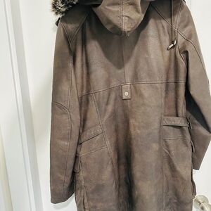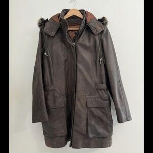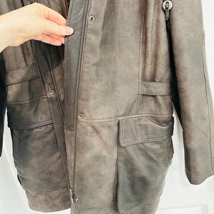 Large cargo style pockets in front. Removable hood, removable faux fur on hood. Removable lining Genuine 100% leather outer.