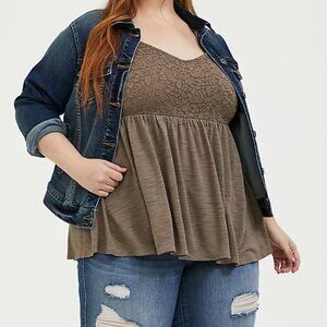 Pretty lace decorates the bodice of this babydoll cami that's a great option for any casual weekend.