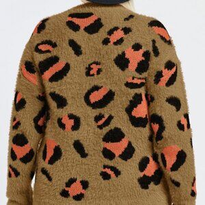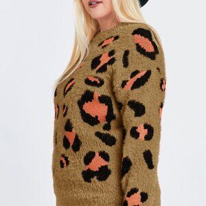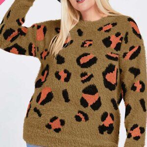 sweater, fuzzy animal print pullover, leopard print knit top, cozy winter sweater, olive green sweater, soft textured sweater, trendy knitwear, chic leopard top, fall winter fashion, boho cozy sweater, statement animal print pullover